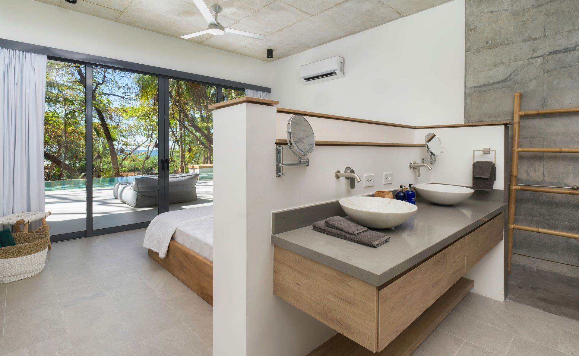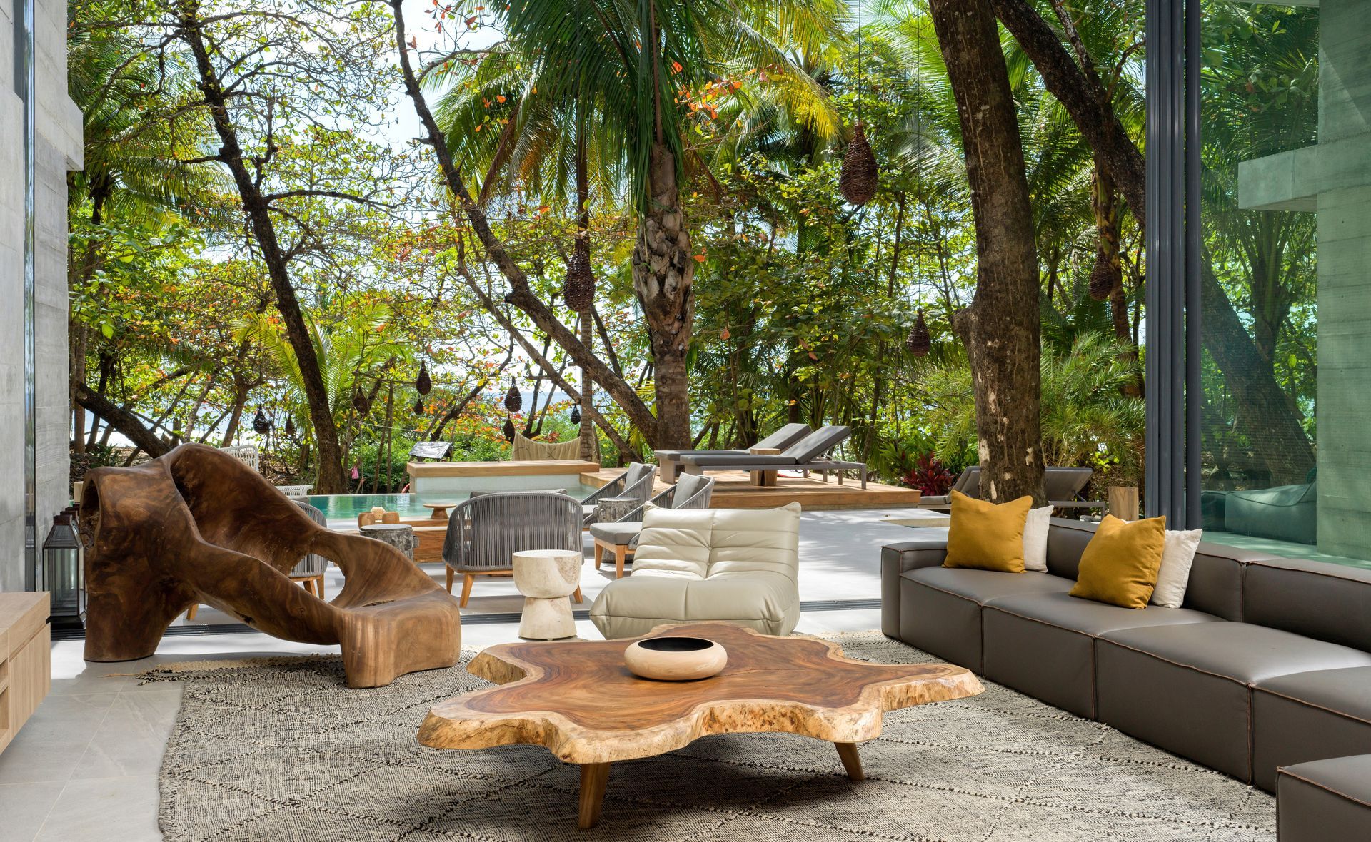- Spacious living room with high ceilings, opens to terrace and pool area