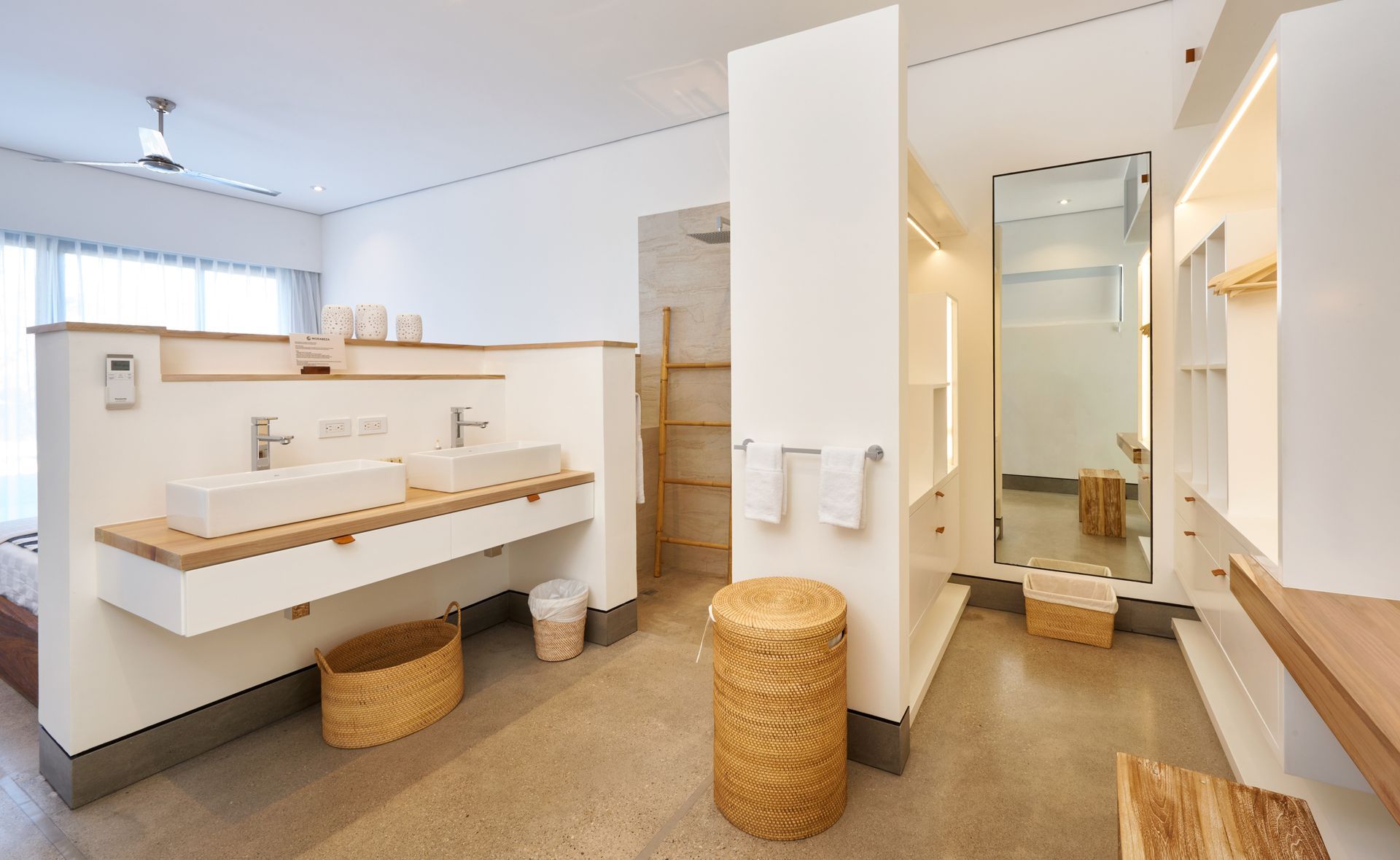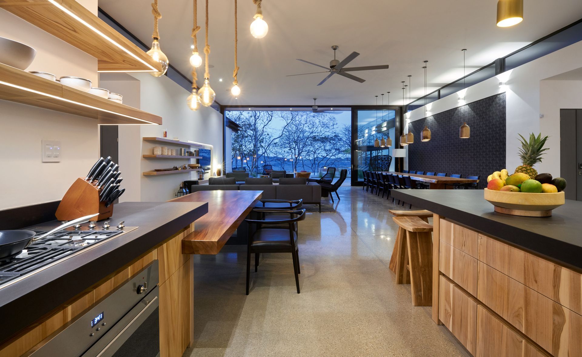 The spacious living areas can be opened entirely towards the terrace, pool, and ocean view. The social area includes one big fully equipped kitchen and a preparation kitchen, an island, and additional seating at an integrated table. The dining area includes an 18-foot-long wooden table that will comfortably seat all 20 guests.