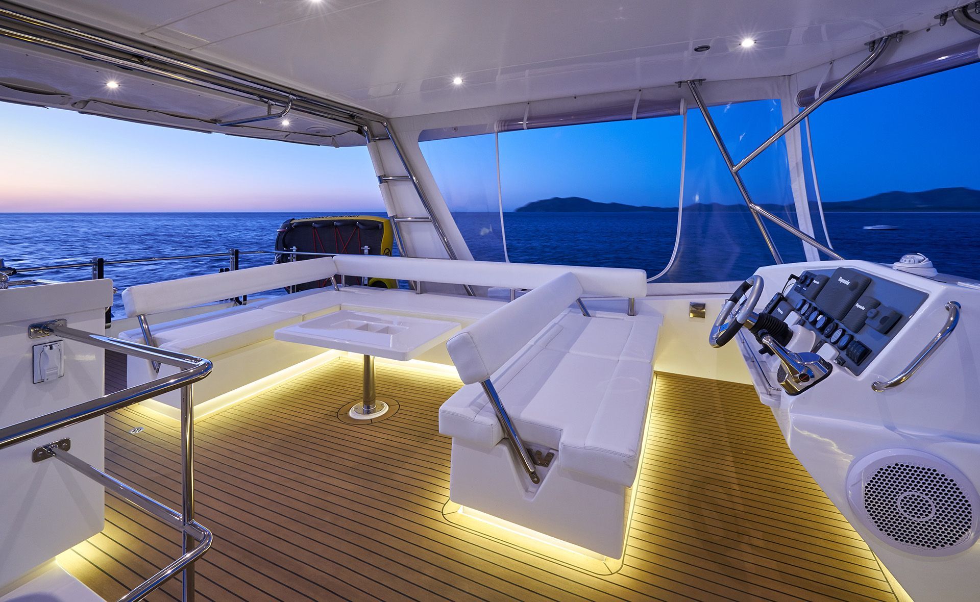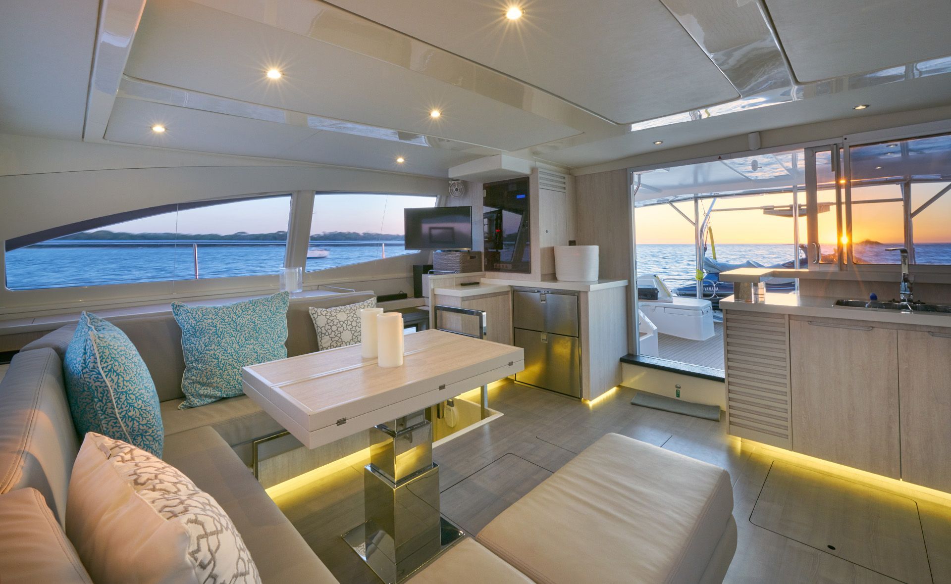 Step into the open saloon area featuring a spacious U-shaped seating for up to eight people. This bright space offers stunning ocean views through large panoramic windows. The aft door opens completely for a seamless outdoor connection, while the front door allows fresh breezes and easy circulation. Embrace the adventure!
